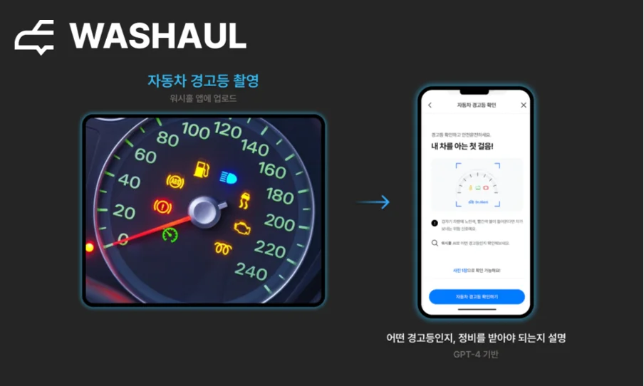 이때 ‘워시홀’을 다운받아 사용해보세요. 차량의 계기판 사진 1장을 찍고 업로드하면 계기판에 대한 정보 및 전문가의 도움이 필요한 상황인지 GPT-4 기반으로 즉시 설명을 드립니다.